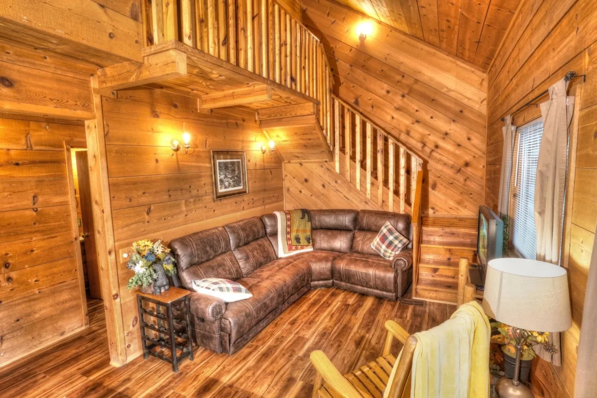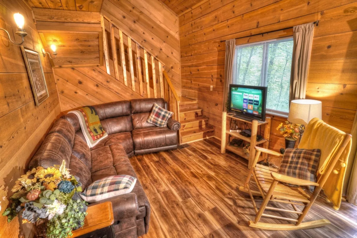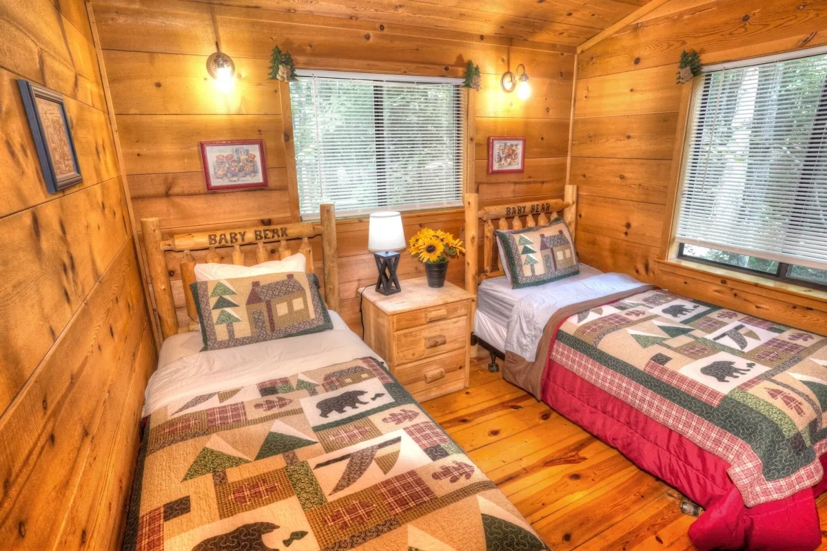 Three Bears Cabin is a charming two-story retreat tucked into a peaceful wooded