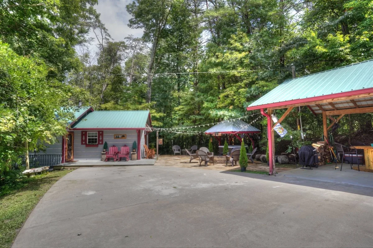 Yes โ Meine Huette has driveway parking and a covered carport. The property has two entrances and ample parking for multiple vehicles.